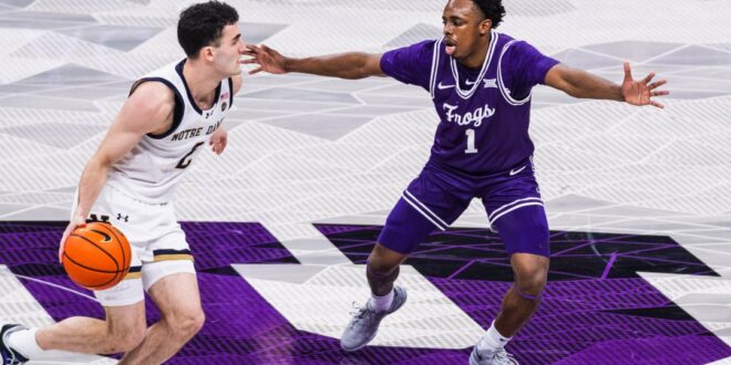 Both teams opened the game hot, each hitting double figures before the first media timeout. Three of TCU’s first four field goals came from beyond the arc—two of them by Jayden Pierre. After a Braeden Shrewsberry triple tied the game at 11, the teams traded buckets until Notre Dame star Markus Burton exited with an ankle injury at the 10-minute mark. In the aftermath, TCU surged on an 11–2 run, capped by a Brock Harding three, its seventh triple of the half.