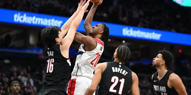 The Wizards led 60-53 at halftime, but Portland was up 104-100 before an 8-0 Washington run. Carrington’s three-point play and a 3-pointer by George gave the Wizards the lead for good.
