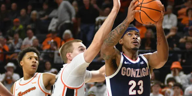 Oregon State held a narrow lead though the first 10 minutes, but Ike’s 3-pointer gave Gonzaga a 22-20 lead and the Bulldogs led until White’s 2-pointer pulled the Beavers even at 34.
