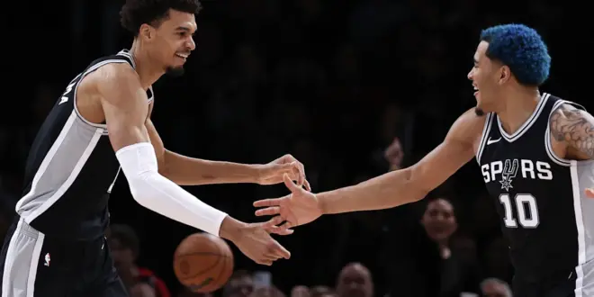 Victor Wembanyama stepped over to Jeremy Sochan during the pregame shoot around. They shared in a warm embrace before Devin Vassell joined in.