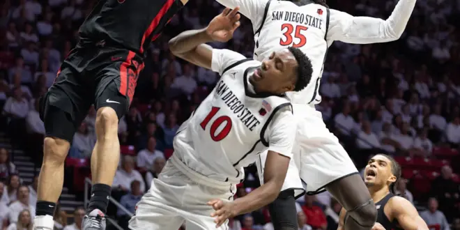 The Aztecs bounced back from Tuesday’s 86-77 loss to Boise State. Both teams shot lights out with the Rebels opening the game on 6 of 9 shooting, including 5 of 6 from three-point whle they build a 19-11 lead. The Aztecs responded as championship teams do with an 11-0 run of their own giving them a 22-19 lead. From there both teams would continue to fight, exchanging leads for most of the rest of the game. Getting down into the clutch, Davis sank two free throws, followed by Reece Dixon-Waters who made one of two for a three point lead. The Rebels (16-15, 11-9 MWC) tried one last gasp with Gibbs-Lawhorn attempting a three which was blocked by Davis sending the Aztecs (20-10, 14-6 MWC) to a season ending victory. UNLV also saw freshman forward Tyrin Jones come off of the bench and score 22 points. The Aztecs had support from Dixon-Waters who added 19 of his own as well as six rebounds. The Aztecs shot a blistering 55% from the field on 33-60…