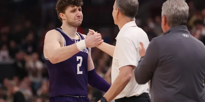 The senior from Glenview, Illinois, who had spent all four years with Northwestern, had just played his final game for the Wildcats. He was caught up with emotion as he stood in the tunnel of United Center on Thursday night. Northwestern head coach Chris Collins was emotional himself in the loss, comforting Martinelli as he rested his head on Collins’ shoulder with tears streaming down his face.