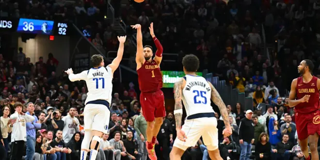CLEVELAND, OHIO – FEBRUARY 27: Max Strus #1 of the Cleveland Cavaliers shoots a half-court shot over Luka Doncic #77 of the Dallas Mavericks to defeat the Mavericks in the last second of the fourth quarter at Rocket Mortgage Fieldhouse on February 27, 2024, in Cleveland, Ohio. The Cavaliers defeated the Mavericks 121-119. NOTE TO USER: User expressly acknowledges and agrees that, by downloading and or using this photograph, User is consenting to the terms and conditions of the Getty Images License Agreement. (Photo by Jason Miller/Getty Images) | Getty Images