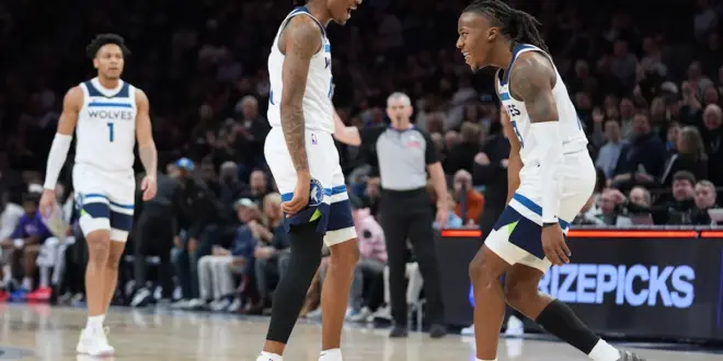 The game was tight early, with eight lead changes and three ties before the Timberwolves took control. With Utah leading 28-27, Bones Hyland made a go-ahead 3-pointer with 2:22 left in the opening quarter — the start of an 8-0 run by Minnesota.