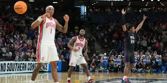 Xavier Edmonds’ shot with 4.1 seconds remaining gave the No. 9 seed Horned Frogs a 66-64 win over No. 8 Ohio State to kick off March Madness action on Thursday, March 19, in the first game of the tournament. Bruce Thornton attempted a halfcourt heave as time expired, but the shot clanked off the top of the backboard.