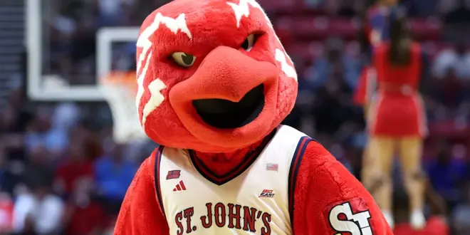 SAN DIEGO, CALIFORNIA – MARCH 20: The St. John's Red Storm mascot performs in the first half of the game against the Northern Iowa Panthers in the first round of the 2026 NCAA Men's Basketball Tournament at Viejas Arena at San Diego State University on March 20, 2026 in San Diego, California. (Photo by Sean M. Haffey/Getty Images) | Getty Images
