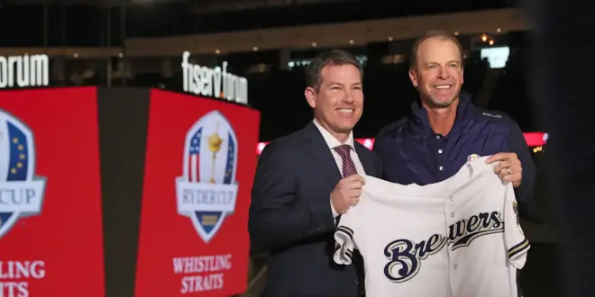 February 20, 2019 Steve Stricker (right) gets presented with a Milwaukee Brewers jersey by Brian Anderson after being introduced as the captain for the 2020 Ryder Cup at Whistling Straits. The event was held at the Fiserv Forum in Milwaukee.