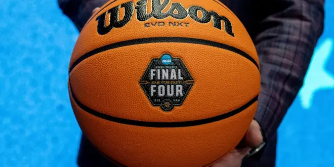 Dave Beachnau, CEO of the Detroit Local Organizing Committee, stands on stage holding a basketball featuring the newly unveiled logo for the 2027 NCAA Men’s Final Four during a press conference inside Ford Field in Detroit on Friday, Dec. 19, 2025. | David Rodriguez Muñoz / USA TODAY NETWORK via Imagn Images