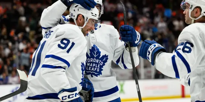 ANAHEIM, Calif. (AP) — John Tavares redirected a shot from Morgan Rielly into the net with five seconds left in overtime to lift the Toronto Maple Leafs to a 5-4 come-from-behind victory over the Anaheim Ducks in a fight-marred game Monday night.