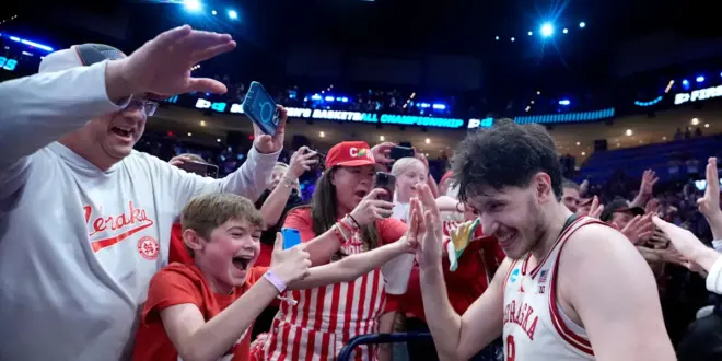 Nebraska’s Berke Buyuktuncel celebrates with fans following a second-round game in the NCAA men’s basketball tournament between Nebraska Cornhuskers and Vanderbilt Commodores at Paycom Center in Oklahoma City on March 21, 2026.
