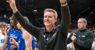 Tulsa Golden Hurricane fans yell in excitement Sunday, April 5, 2026, during the NIT men’s basketball championship game at Gainbridge Fieldhouse in Indianapolis.
