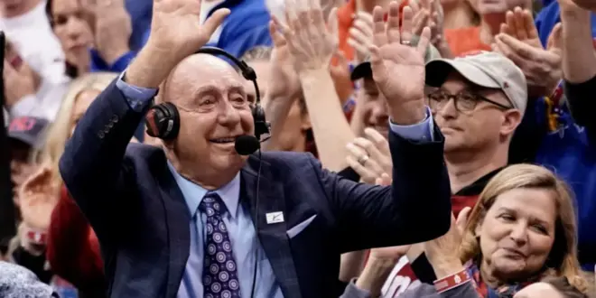 Sportscaster Dick Vitale waves to the crowd as he is honored during a game between Indiana Hoosiers and Kansas Jayhawks in the first half at Allen Fieldhouse on December 17, 2022 in Lawrence, Kansas. Getty Images