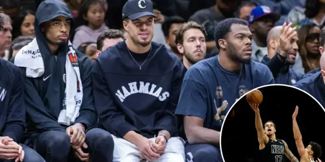 Nets center Nic Claxton (l.), Michael Porter Jr. (c.) and Day’ron Sharpe look on during the second half against the Atlanta Hawks at Barclays Center, Friday, April 3, 2026, in Brooklyn, NY. Corey Sipkin for the NY POST