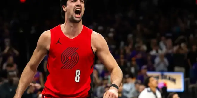 Deni Avdija, who scored 41 points, celebrates during the Trail Blazers 114-110 win over the Suns on April 14, 2026 in Phoenix. Mark J. Rebilas-Imagn Images