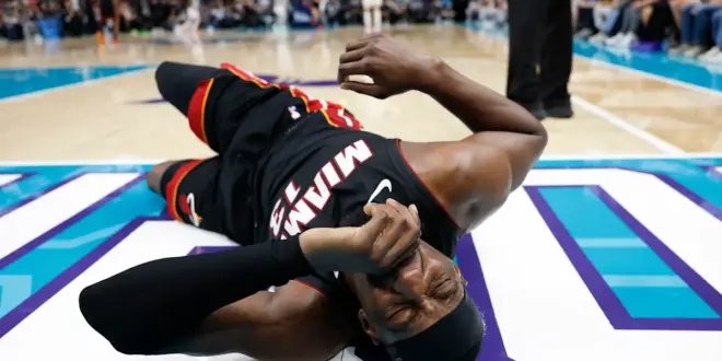 CHARLOTTE, N.C. (AP) — Miami Heat center Bam Adebayo limped off the court early in the second quarter of Tuesday night’s play-in game against Charlotte when he got tripped by Hornets point guard LaMelo Ball, causing him to land hard on his back.
