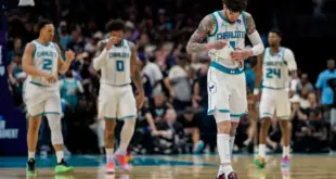 Above, LaMelo Ball #1 celebrates with Coby White #3 of the Charlotte Hornets in overtime against the Miami Heat during their game at Spectrum Center on April 14, 2026, in Charlotte, North Carolina.